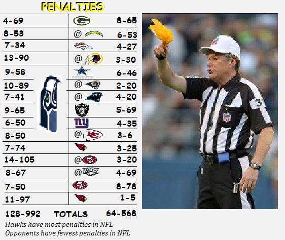 Most of Seattle’s flags were merited — even if Carroll says Michael Bennett thinks he was not offsides on consecutive plays. Bennett is second in the NFL with 12 penalties — almost all of them pre-snap. Maybe he needs to get corrective eye surgery in the offseason.