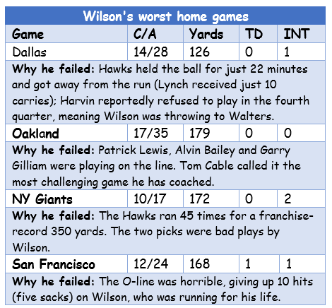 When it comes to passing, Wilson has been as bad at home this season as he was on the road as a rookie — believe it or not.