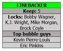 The defensive line seems pretty set. The coaches probably will lean toward keeping 10, counting Cassius Marsh, who has played most of his snaps this preseason as a pass rusher. The biggest surprise here is the return of Tony McDaniel, who clearly has played well enough to make the roster — and possibly start.