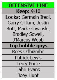 The last two or three spots seemingly come down to Patrick Lewis, Joey Hunt, Terry Poole and Jahri Evans. Poole has looked pretty good at right tackle and probably would be the 10th guy if they keep that many. If they keep just nine, Evans and one of the two centers likely would be the final two. Hunt seems to be getting every chance to beat out the more expensive Lewis — but do the Hawks really want a rookie backing up a first-timer starter?