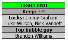 Brandon Williams had his best game vs. Dallas, which was good to see because Nick Vannett is questionable for the opener. The Hawks surely will keep four here, especially with Vannett injured and Jimmy Graham still working his way back. He had a great pregame workout, Pete Carroll said, which makes it seem like he could be back for the opener. But Williams offers good insurance, as well as top special-teams help.