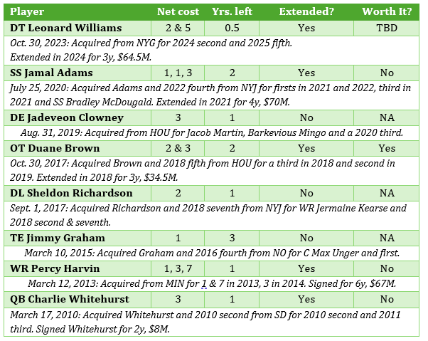 Schneider extended Whitehurst and Harvin as part of those trades and then got deals with Brown, Adams and now Williams after the seasons in which they were acquired. Brown was the only extended player of the previous four who turned out to be worth it.