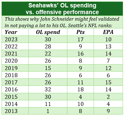 That is exactly where the Seahawks are right now – two third-year guys, two second-year guys and a TBD. That’s a recipe for a repeat of 2016 or perhaps 2023, when they were 17th in scoring and (somehow) 10th in EPA.