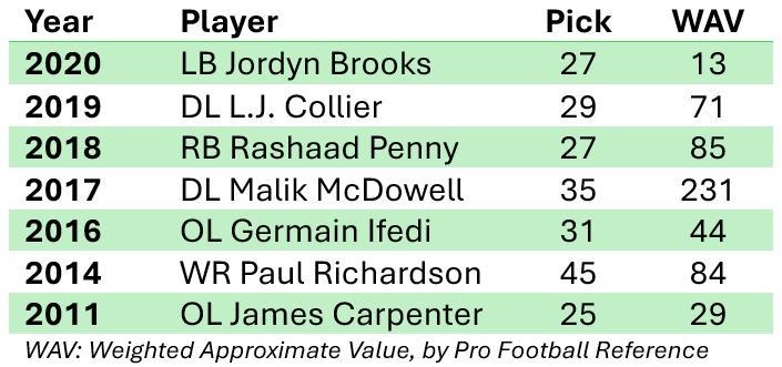 Of the seven drafted in the bottom of the first (or top of the second, via trade-downs), all but Jordyn Brooks underperformed their draft slots.